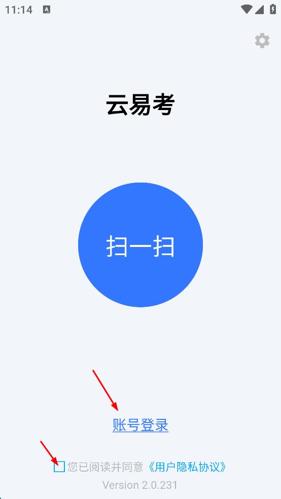 1、打開云易考應(yīng)用,在初始頁面找到您已閱讀并同意用戶隱私協(xié)議前的方框,點擊勾選,接著點擊“賬號登錄”選項。