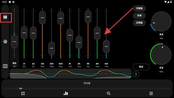 2、進(jìn)入調(diào)節(jié)的界面內(nèi),在中間的區(qū)域進(jìn)行拖動按鈕來調(diào)節(jié)完美的音質(zhì)。