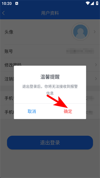4、在提示框中點擊確定,完成智慧安防退出登錄操作。