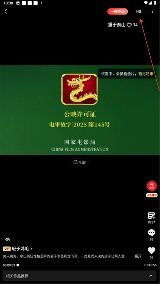 3、進(jìn)入電影播放的界面內(nèi),點(diǎn)擊右上下載按鈕即可開(kāi)始。