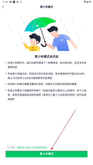 4、在該頁(yè)面內(nèi),點(diǎn)擊青少年模式的按鈕即可開(kāi)啟成功。