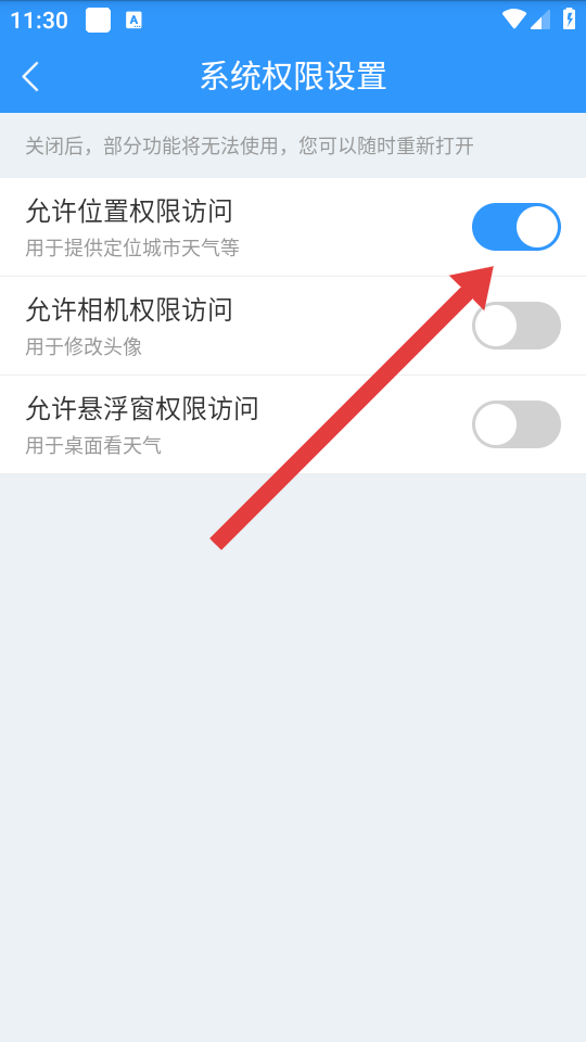 3、在系統(tǒng)權(quán)限設(shè)置頁面,找到允許位置權(quán)限訪問選項(xiàng),將其右側(cè)的開關(guān)按鈕切換為開啟狀態(tài),即可打開定位權(quán)限。