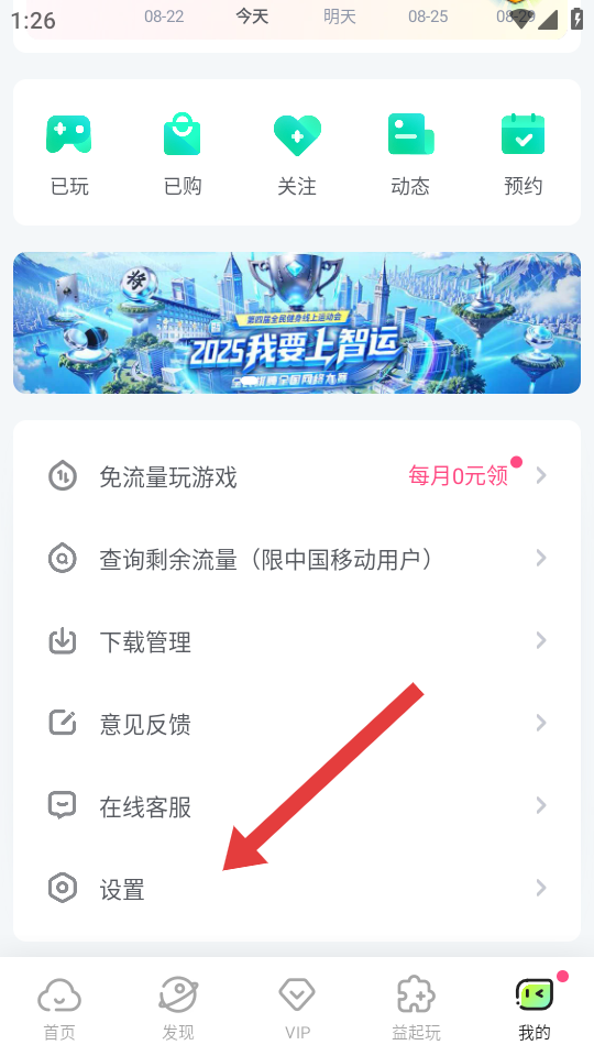 1、進(jìn)入到咪咕快游我的頁(yè)面,需要找到并點(diǎn)擊最下面設(shè)置的選項(xiàng),這是進(jìn)入賬號(hào)操作的前置步驟。