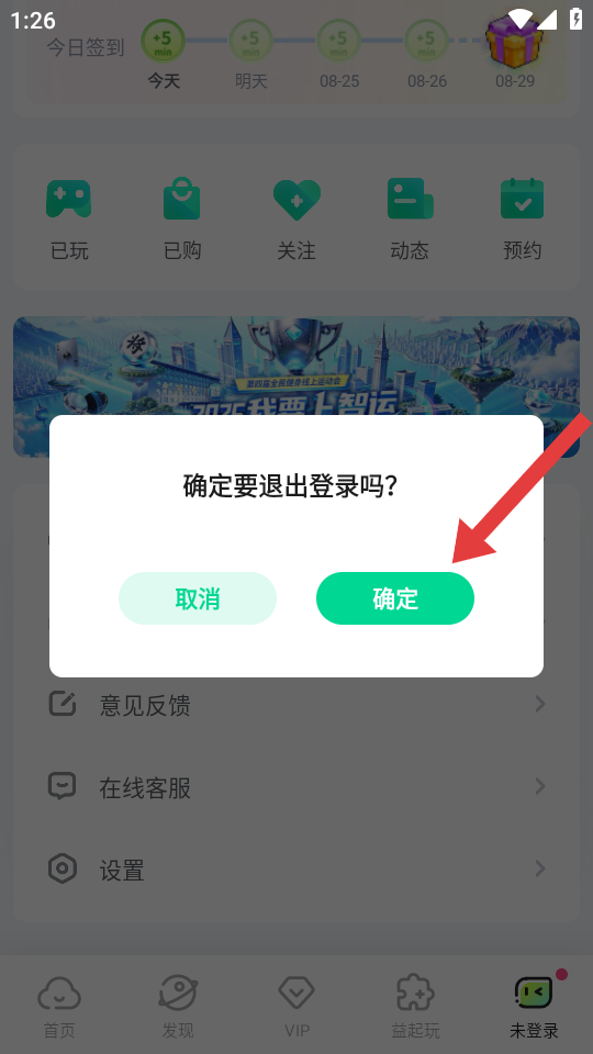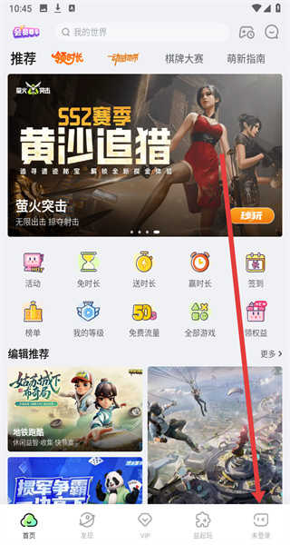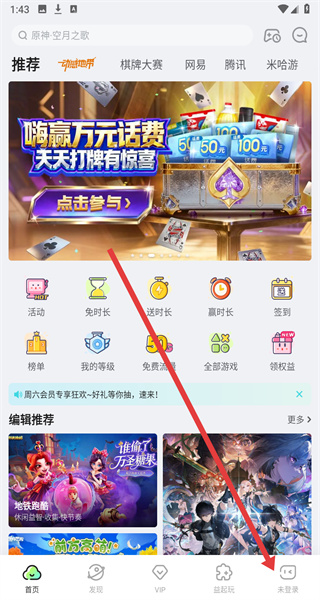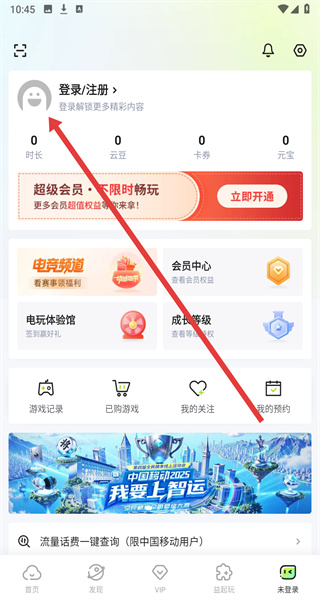 1、在咪咕游戲APP首頁(yè)點(diǎn)擊右下角“未登錄”,進(jìn)入個(gè)人頁(yè)面。