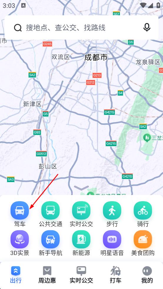 2、在主界面下方功能欄,找到“駕車”圖標(biāo),點(diǎn)擊進(jìn)入駕車導(dǎo)航設(shè)置頁(yè)面,準(zhǔn)備規(guī)劃駕車路線 。