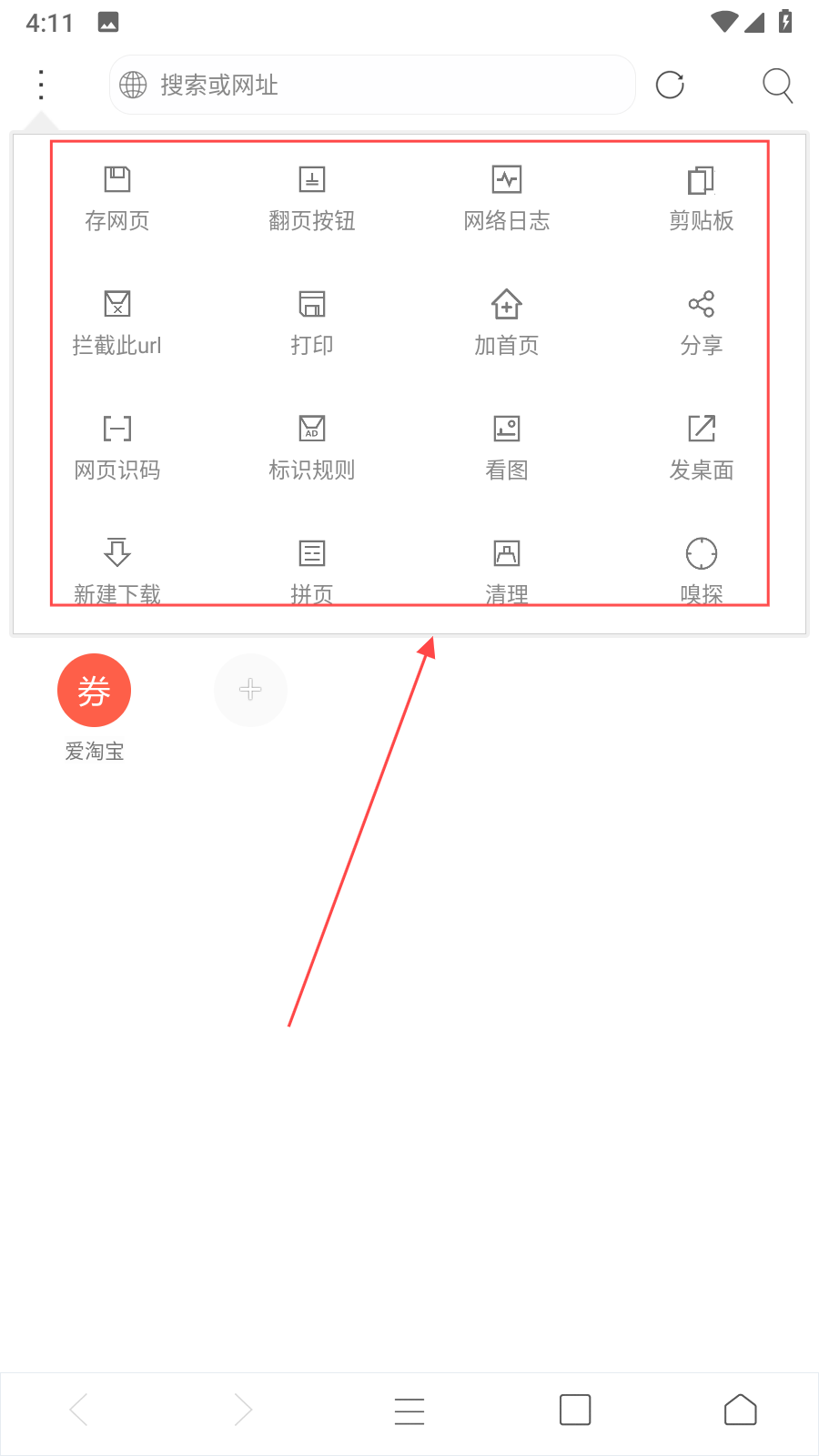 1、點擊左上角三點圖標,會彈出功能菜單,里面有存網(wǎng)頁、翻頁按鈕、網(wǎng)絡日志、剪貼板等多種功能選項,可根據(jù)需求點擊相應功能進行操作。
