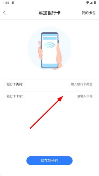 3、在添加銀行卡頁面,依次輸入銀行卡類別和銀行卡卡號,點擊保存到卡包按鈕,完成銀行卡添加。