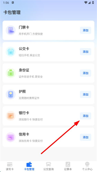 2、在卡包管理頁面,找到銀行卡選項,點擊其右側(cè)的添加按鈕。