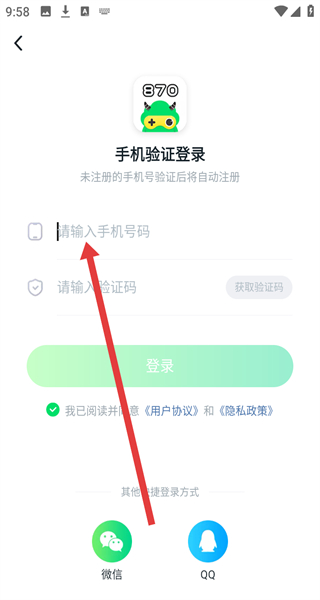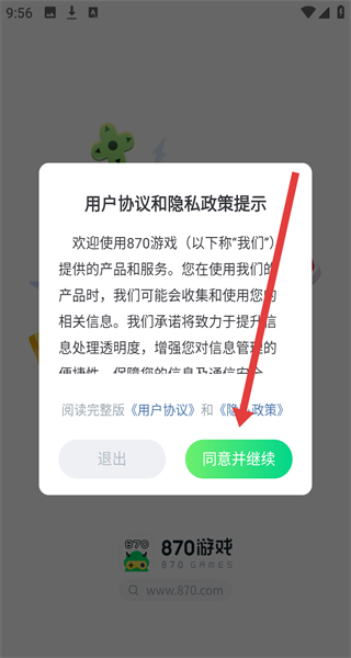 1、點(diǎn)擊“用戶協(xié)議和隱私政策提示”彈窗的“同意并繼續(xù)”,進(jìn)入870游戲APP主界面。