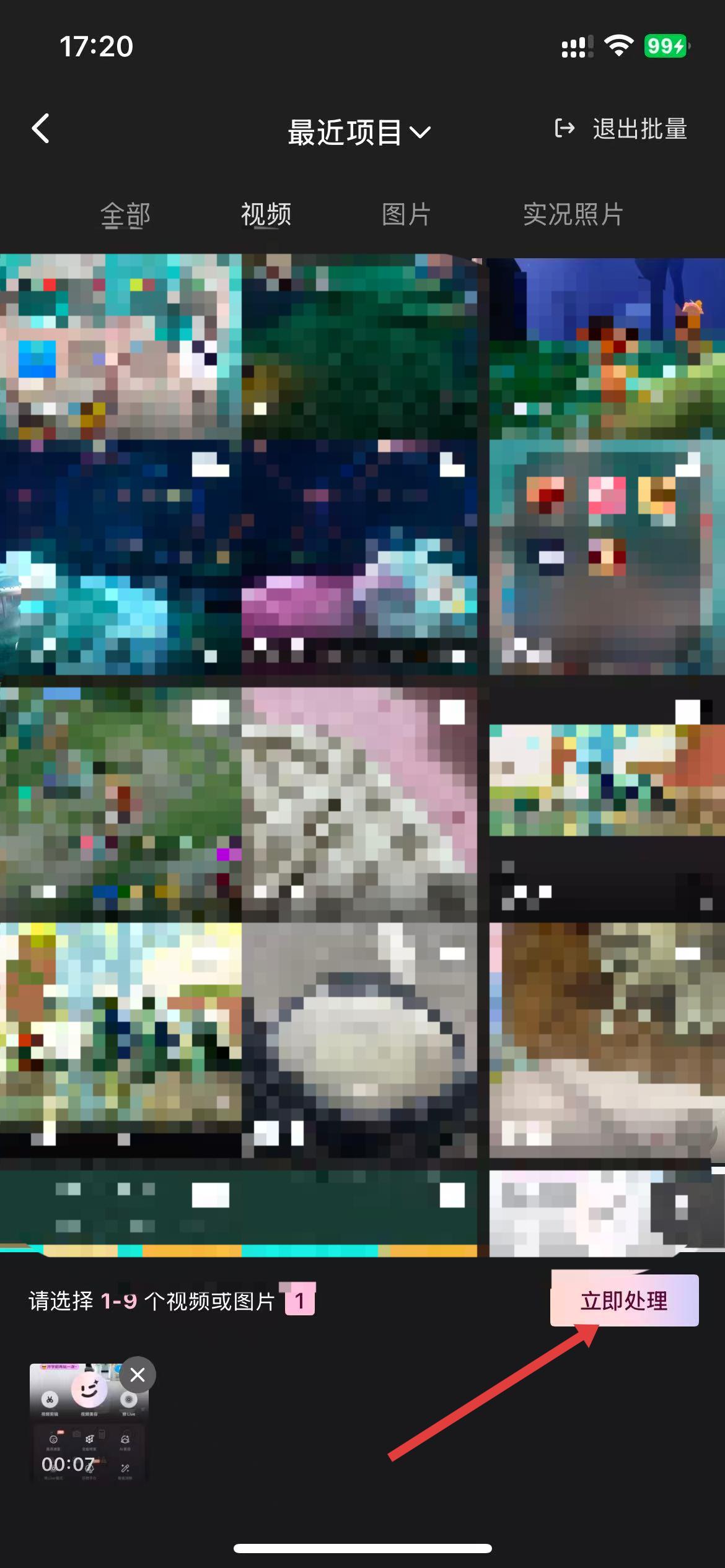 3、點擊選擇需要修復畫質(zhì)的視頻,點擊立即處理。