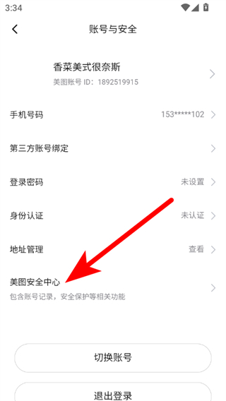 3、在賬號頁面中找到美圖安全中心選項并點擊,進入美圖安全中心頁面。