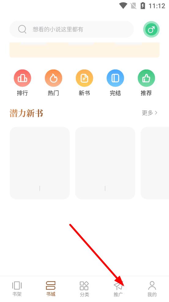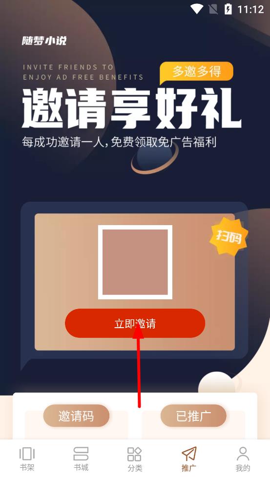 1、打開隨夢小說應(yīng)用,點(diǎn)擊底部導(dǎo)航欄里的推廣選項(xiàng),進(jìn)入推廣頁面。