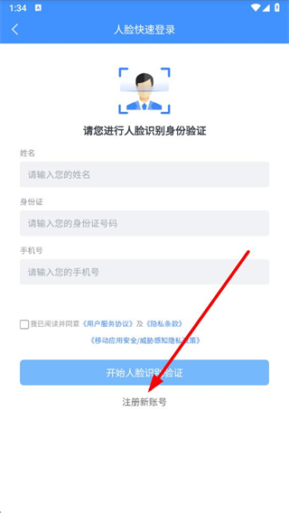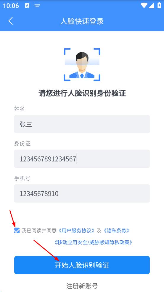 4、輸入完姓名、身份證號碼、手機號碼后,勾選同意用戶服務(wù)協(xié)議及隱私條款,移動應(yīng)用安全/威脅感知隱私政策,然后點擊開始人臉識別驗證按鈕,進行人臉識別身份驗證。