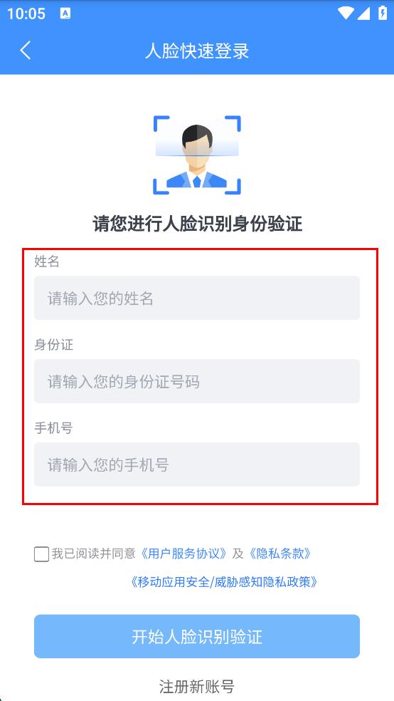 3、在個人相關(guān)頁面,進入人臉快速登錄界面,依次在姓名、身份證、手機號的輸入框中,分別輸入自己的姓名、身份證號碼、手機號碼。