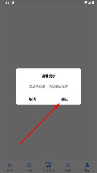 2、點擊我的按鈕后,在彈出的溫馨提示彈窗,點擊確認按鈕可進入登錄環(huán)節(jié)。