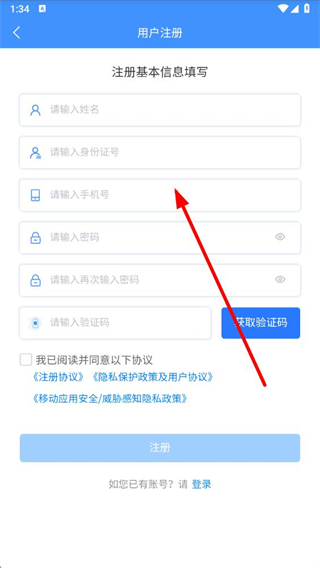 4、進入頁面依次填寫個人信息和密碼,獲取驗證碼,勾選協(xié)議后點擊注冊,進行人臉識別驗證完成注冊。