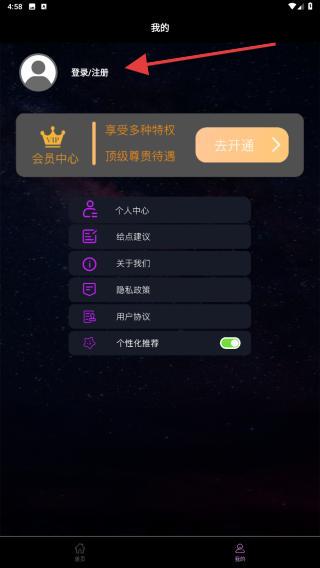 2、在我的頁面內(nèi),點擊登錄/注冊的區(qū)域。