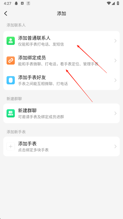 1、進入添加頁面,可選擇添加普通聯(lián)系人,添加綁定成員,添加手表好友,根據(jù)需求選擇對應(yīng)選項,完成聯(lián)系人或好友添加,也能點擊新建群聊,邀請手表及綁定成員進群。