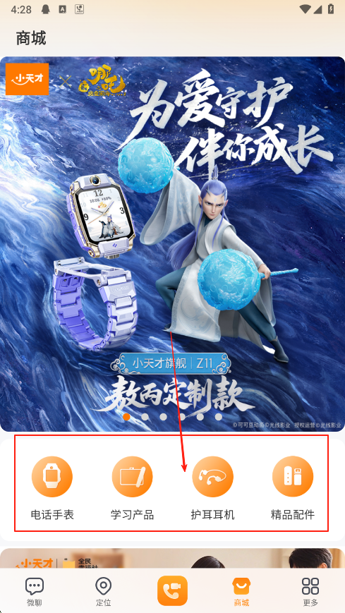 2、切換到商城頁面,能看到電話手表,學(xué)習(xí)產(chǎn)品,護耳耳機,精品配件等分類,根據(jù)需要點擊分類,瀏覽相關(guān)產(chǎn)品,了解產(chǎn)品信息,選擇心儀產(chǎn)品進行查看或購買。