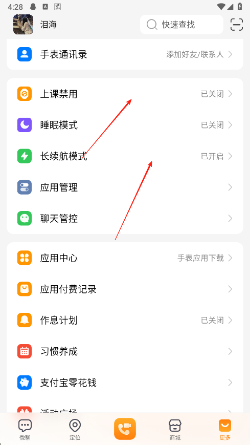 3、進入更多頁面,可對上課禁用,睡眠模式,長續(xù)航模式等進行設(shè)置,根據(jù)使用場景開啟或關(guān)閉相應(yīng)模式,也能進行應(yīng)用管理、聊天管控等操作,還可進入應(yīng)用中心下載手表應(yīng)用。