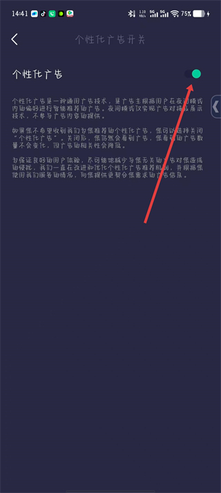4、在個(gè)性化廣告開(kāi)關(guān)頁(yè)面,點(diǎn)擊右側(cè)的開(kāi)關(guān)。
