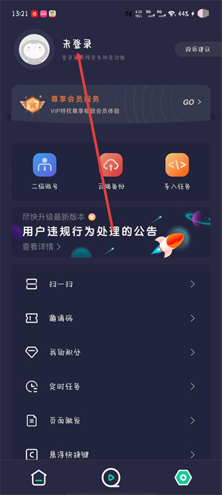 2、在設(shè)置頁(yè)面中,找到未登錄區(qū)域并點(diǎn)擊,跳轉(zhuǎn)至登錄界面。