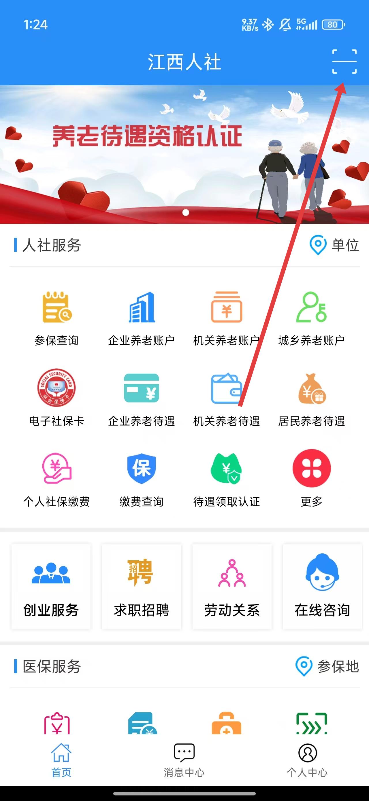 2、在江西人社首頁中,可以點(diǎn)擊右上角的掃描按鈕,進(jìn)行掃描。