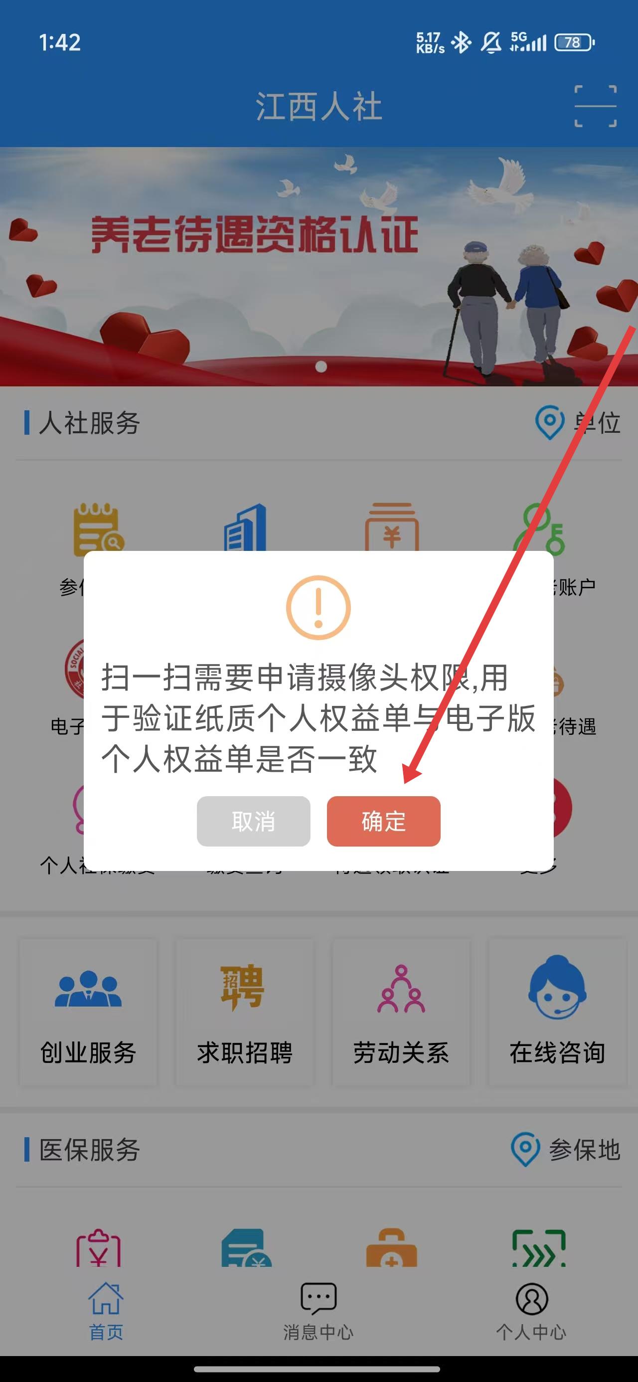 3、可以點(diǎn)擊確定按鈕,允許江西人社獲取攝像頭權(quán)限進(jìn)行掃描操作。