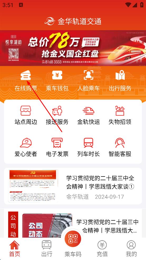 2、登錄后回到首頁,點擊在線購票選項,進入購票界面,可根據(jù)需求選擇購票相關(guān)操作,如選擇站點、票數(shù)等。
