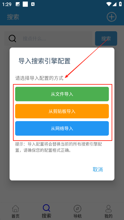 2、點(diǎn)擊導(dǎo)入配置后會(huì)彈出導(dǎo)入搜索引擎配置窗口,這里有從文件導(dǎo)入,從剪貼板導(dǎo)入,從網(wǎng)絡(luò)導(dǎo)入,三種方式,根據(jù)自己擁有的配置資源情況,選擇一種合適的導(dǎo)入方式。