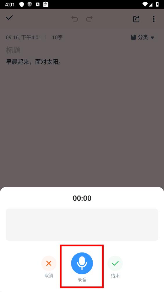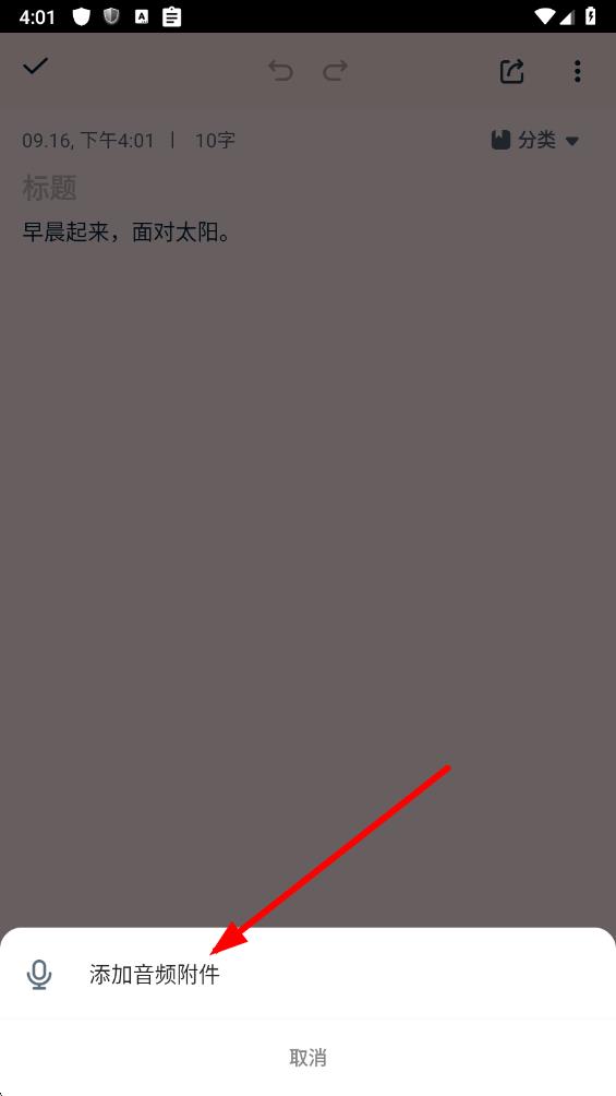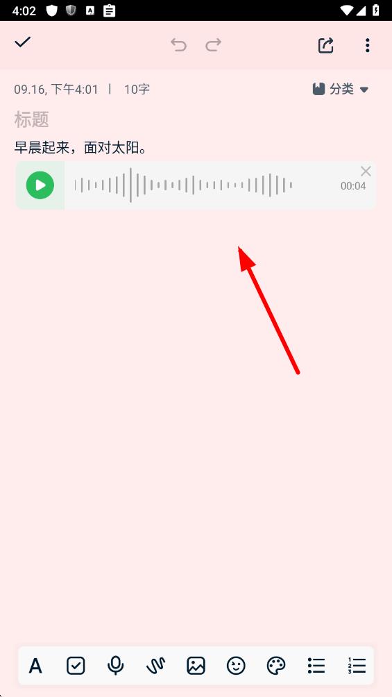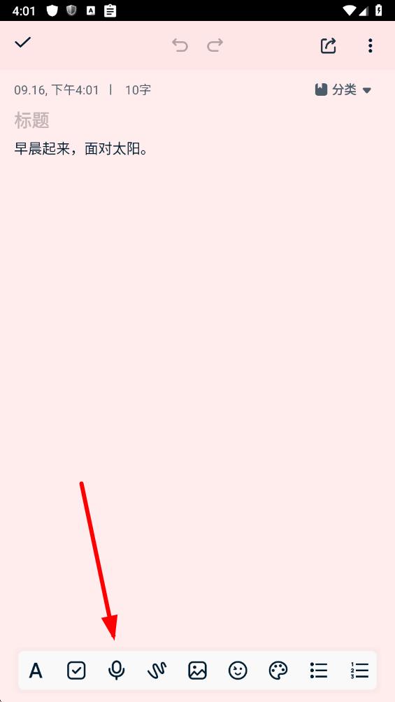 2、在筆記編輯頁面下方的功能欄中,點擊麥克風圖標,喚出添加音頻附件選項。