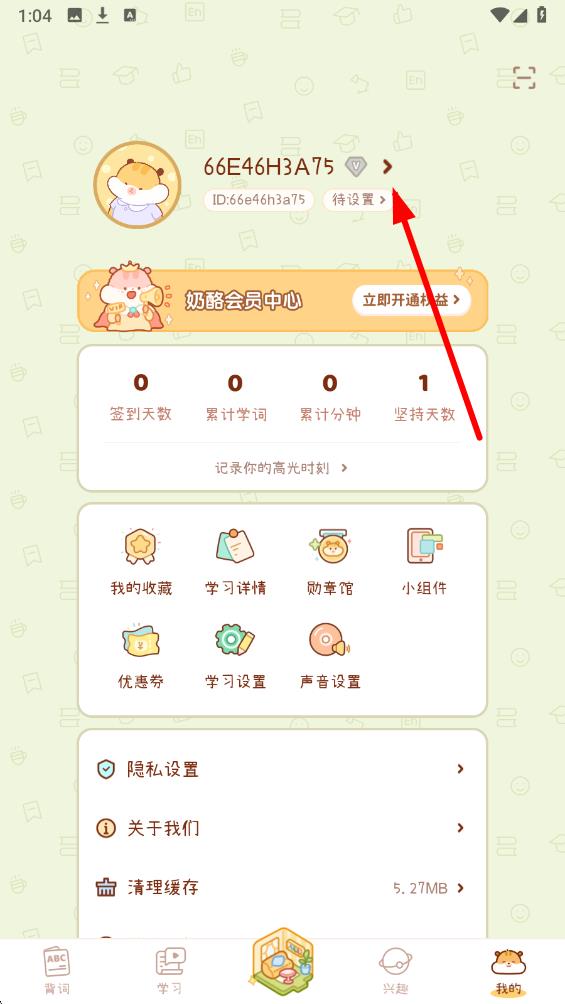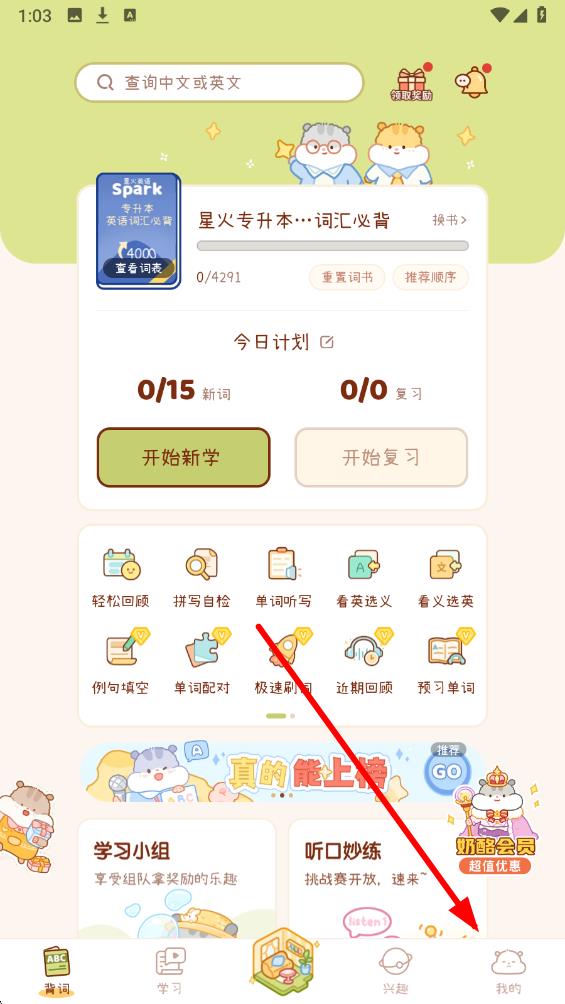 1、打開奶酪單詞app進入主界面,點擊屏幕底部導航欄最右側的我的圖標進入個人中心頁面。