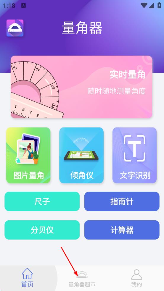 1、打開量角器APP首頁(yè),點(diǎn)擊底部量角器超市。