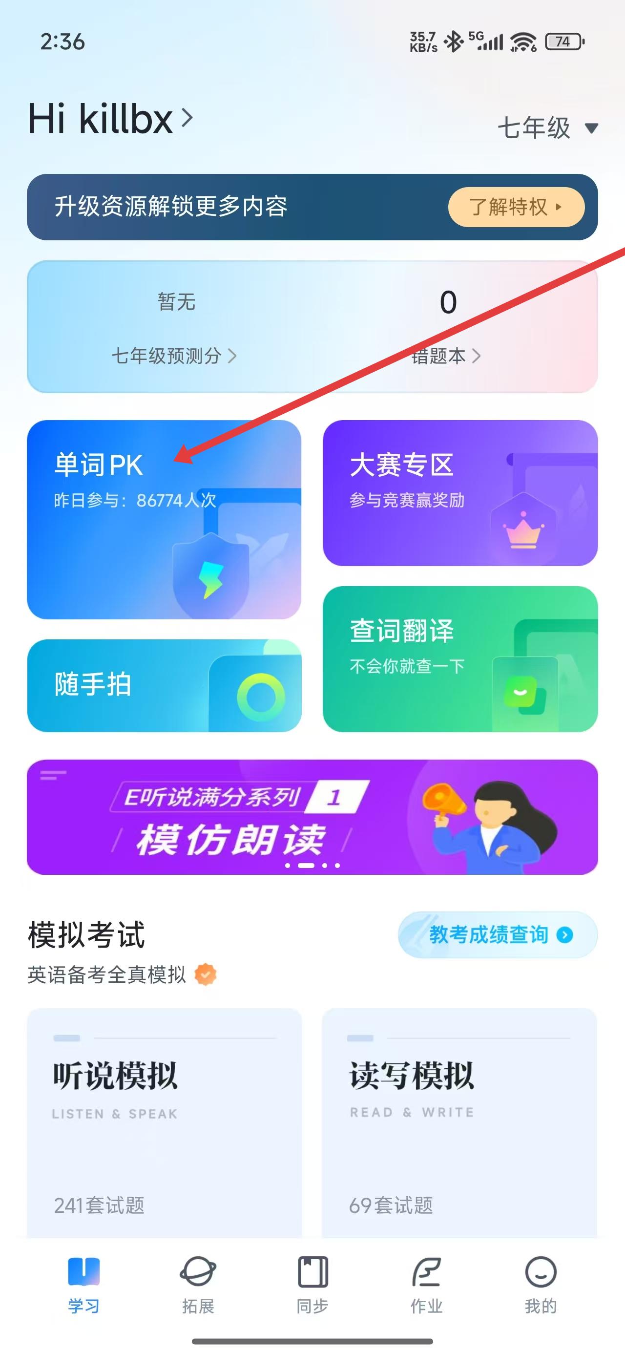 1、登錄E聽(tīng)說(shuō)APP后,在學(xué)習(xí)首頁(yè)點(diǎn)擊單詞PK模塊,進(jìn)入單詞PK功能界面。