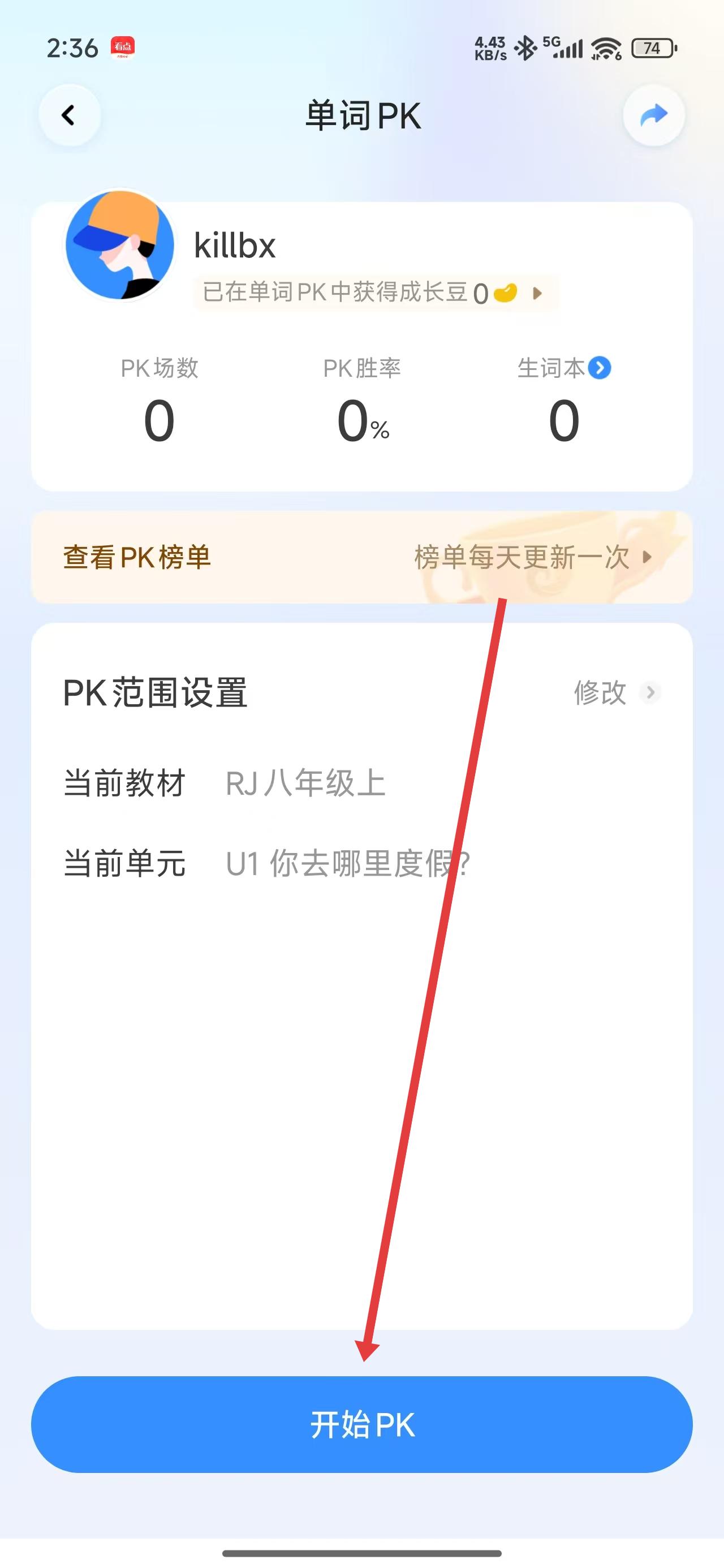 2、單詞PK界面點(diǎn)擊底部開(kāi)始PK按鈕,啟動(dòng)單詞對(duì)戰(zhàn)游戲。