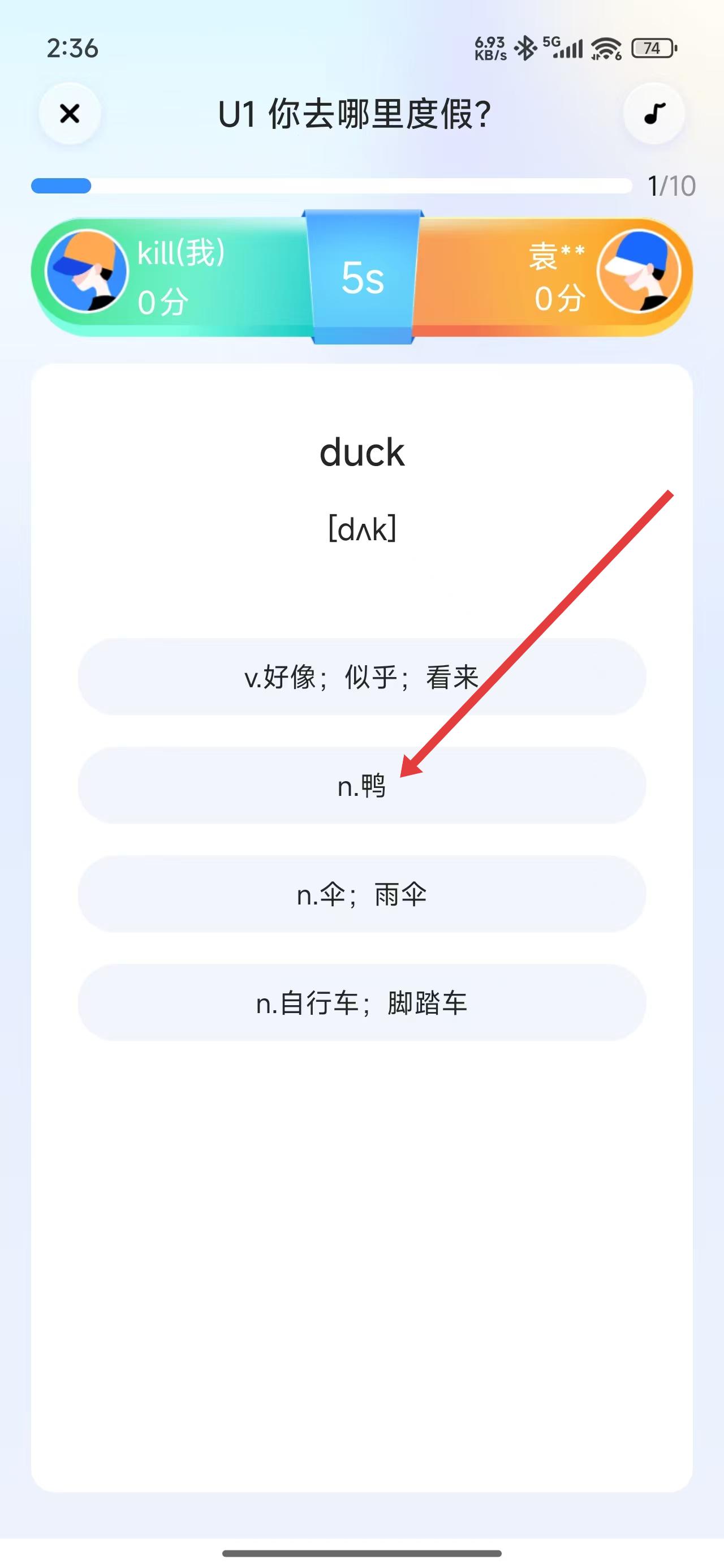 3、對(duì)戰(zhàn)答題時(shí),選擇單詞duck對(duì)應(yīng)的正確釋義n.鴨,完成該題作答。