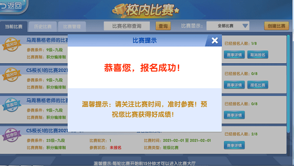 注意:比賽在創(chuàng)建時(shí),參賽選手為“自主報(bào)名”時(shí),學(xué)生方可報(bào)名參賽;如果為“錄入名單”需要老師錄入?yún)①悓W(xué)生名單,無需報(bào)名。報(bào)名成功后系統(tǒng)會(huì)彈出報(bào)名成功。