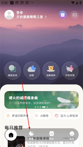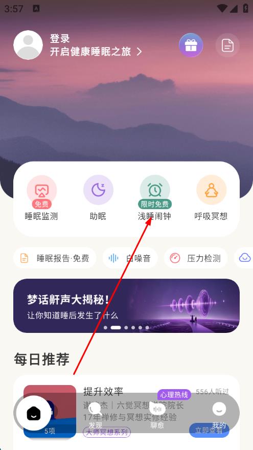 1、打開幻休助眠應(yīng)用,在首頁點(diǎn)擊淺睡鬧鐘選項(xiàng)。