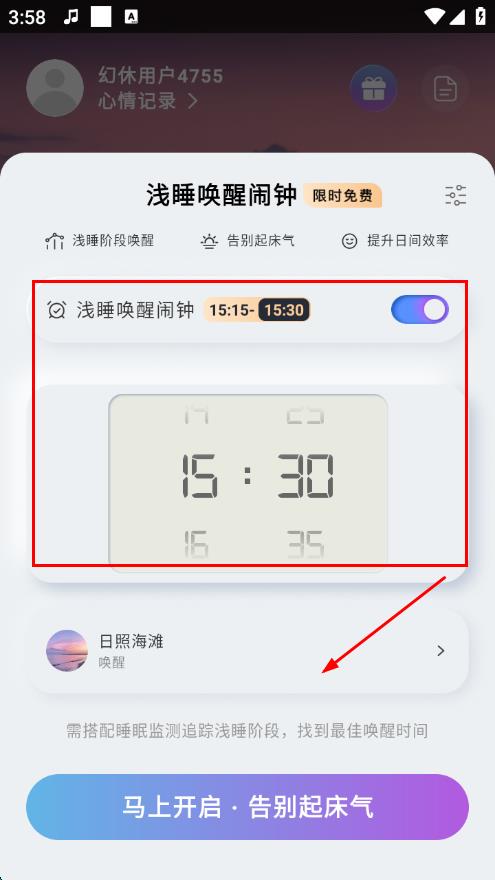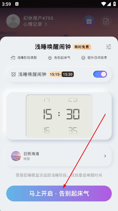 4、返回淺睡喚醒鬧鐘頁面,點(diǎn)擊馬上開啟·告別起床氣按鈕,即可開啟鬧鐘提醒。