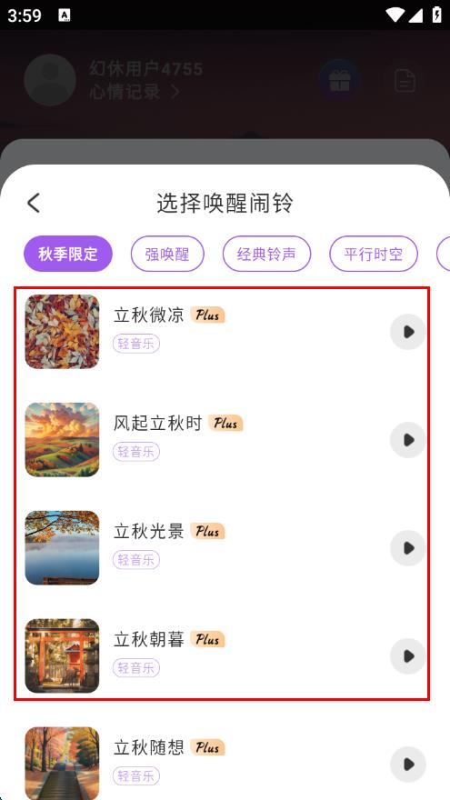 3、點(diǎn)擊鬧鐘鈴聲相關(guān)區(qū)域,進(jìn)入選擇喚醒鬧鈴頁面,挑選喜歡的鬧鈴。