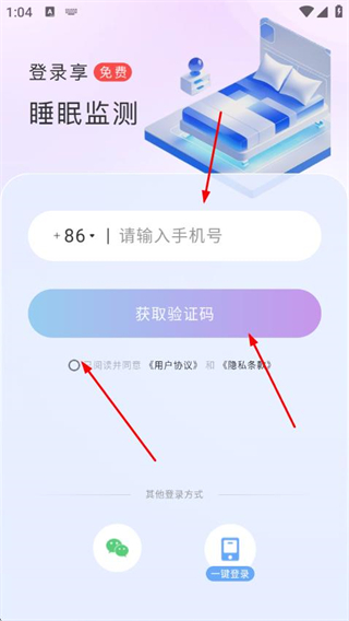 2、在登錄頁面輸入手機(jī)號,勾選用戶協(xié)議,點(diǎn)擊獲取驗(yàn)證碼。