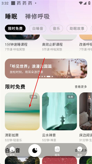 2、在助眠內(nèi)容頁面的限時(shí)免費(fèi)板塊中,選擇想要聽的音樂,點(diǎn)擊進(jìn)入音樂播放頁面。