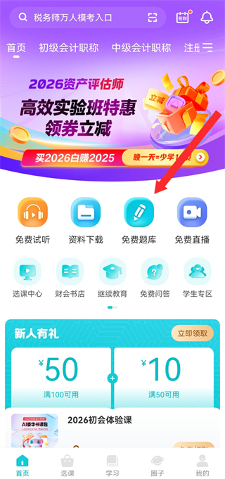 1、在正保會計網(wǎng)首頁,點擊免費題庫,進(jìn)入初級會計職稱練習(xí)頁面。