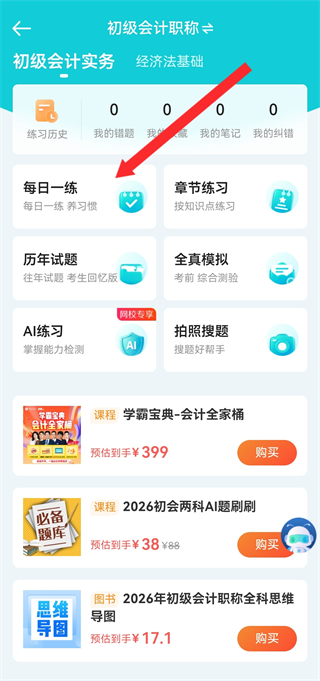 2、在初級會計職稱練習(xí)頁面,點擊每日一練,進(jìn)入每日練習(xí)設(shè)置頁面。