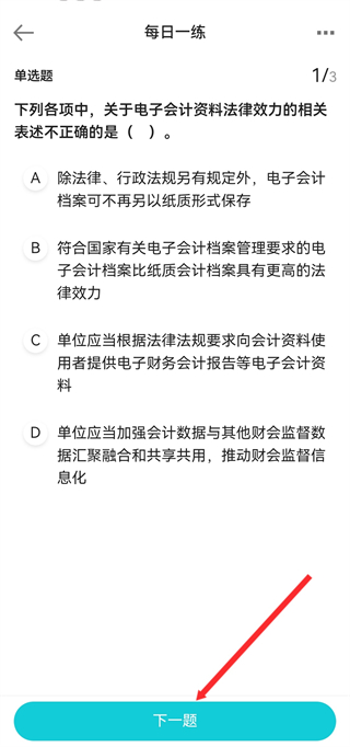4、在題目作答的頁面,完成題目后點擊下一題,繼續(xù)進(jìn)行練習(xí)操作。