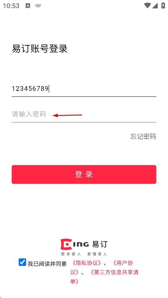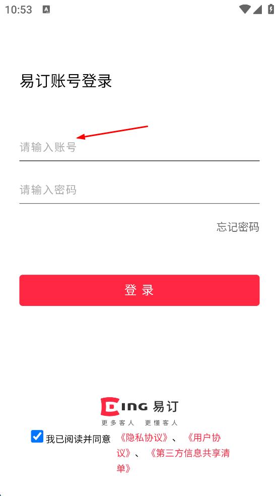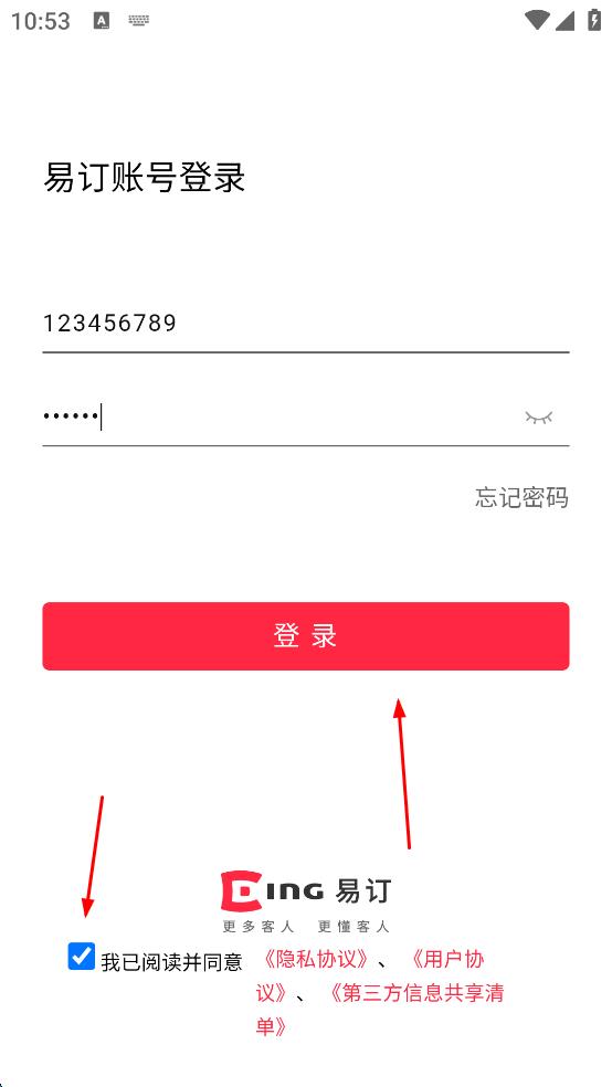 4、輸入完賬號(hào)和密碼后,勾選“我已閱讀并同意協(xié)議,然后點(diǎn)擊“登錄”按鈕,完成易訂APP的賬號(hào)登錄操作。