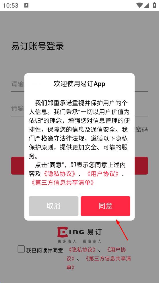 1、打開易訂APP,會(huì)彈出“歡迎使用易訂App”的提示框,仔細(xì)閱讀相關(guān)內(nèi)容后,點(diǎn)擊“同意”按鈕,進(jìn)入易訂賬號(hào)登錄界面。