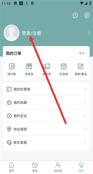 2、在個人中心頁面點擊“登錄/注冊”,進入登錄注冊選擇頁面。
