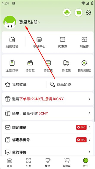 2、在我的頁面,找到并點(diǎn)擊上方的登錄/注冊選項(xiàng)。