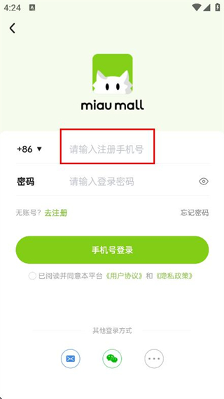 3、在登錄頁面,在輸入框內(nèi)輸入需要登錄的手機(jī)號。